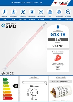 Świetlówka LED do mięsa (MEAT TUBE) T8 G13 120cm 18W 1530 lm VT-1228