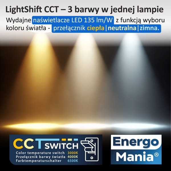 Odkryj serię nowoczesnych naświetlaczy LightShift CCT marki EnergoMania® – halogenów z wydajnymi diodami premium SMD 135 lm/W. Reflektory LED wyróżniają się solidną, aluminiową obudową w kolorze czarnym z wzmocnionym uchwytem montażowym typu U. Profesjonalna, wbudowana przetwornica w technologii flicker free (stabilne światło) pozwala na bezawaryjną pracę lampy przez długie lata - produkt objęty 60-miesięcznym okresem gwarancji. Innowacją jest zastosowanie przełącznika zmiany barwy światła - ostateczny wybór koloru świecenia halogenu można ustawić już po zamontowaniu naświetlacza LED.