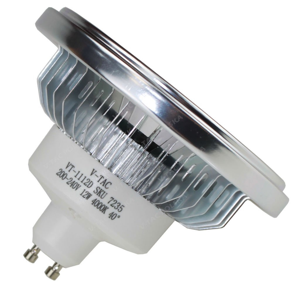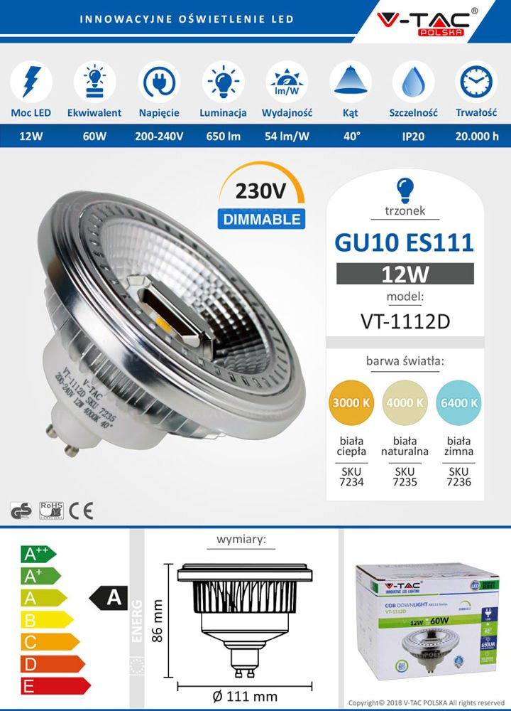 Żarówka LED VT-1112D ES111 marki V-TAC® ma moc 12W i mocowanie GU10. Lampa oparta jest na dwóch wydajnych diodach COB marki SHARP przytwierdzonych do aluminiowej obudowany z żebrowanym radiatorem. Halogen LED AR111 jest zasilany napięciem 200-240V AC, współpracuje ze ściemniaczem. Źródło światła posiada wysoki wskaźnik oddawania barw CRI: Ra>80. Generowany strumień świetlny wynosi ponad 1031 lm - odpowiednik 80W halogenu. Lampa dzięki odbłyśnikowi ma ukierunkowany kąt świecenia 40°. Wymiary Ø111 x 86 mm. Gwarancja 24 miesiące.