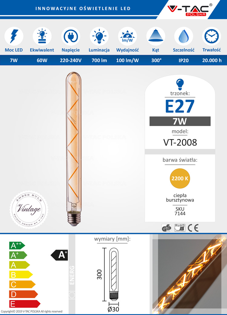 Żarówka LED T30 VT-2008 marki V-TAC® ma moc 7W i gwint E27. Oparta jest na wydajnych i stylowych diodach typu FILAMENT (świetlne pręciki). Źródło światła posiada wysoki wskaźnik oddawania barw CRI: Ra>80. Generowany strumień świetlny wynosi ponad 700 lm - odpowiednik 60W halogenu. Lampa emituje światło pod kątem 300°. Wymiary Ø30 x 300 mm. Gwarancja 24 miesiące.