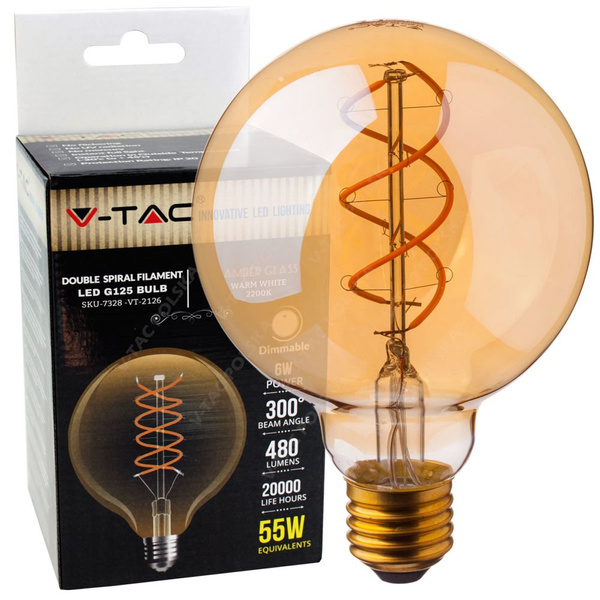 Żarówka LED G125 VT-2126 marki V-TAC® ma moc 6W i gwint E27. Oparta jest na wydajnych i stylowych diodach typu FILAMENT (świetlne pręciki). Źródło światła posiada wysoki wskaźnik oddawania barw CRI: Ra>80. Generowany strumień świetlny wynosi 480 lm - odpowiednik 60W halogenu. Lampa emituje światło pod kątem 300°.