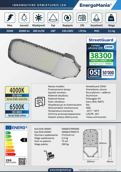 Lampa uliczna LED marki EnergoMania® jest energooszczędną alternatywą dla typowych opraw sodowych 600W. Latarnia StreetGuard ma aluminiowy korpus z żebrowanym radiatorem, do którego przytwierdzona jest płyta PCB z diodami SMD 180 lm/W - klasa energetyczna C. Dostęp do komory optycznej chroni klosz z poliwęglanu i sylikonowa uszczelka - odporność IP65.