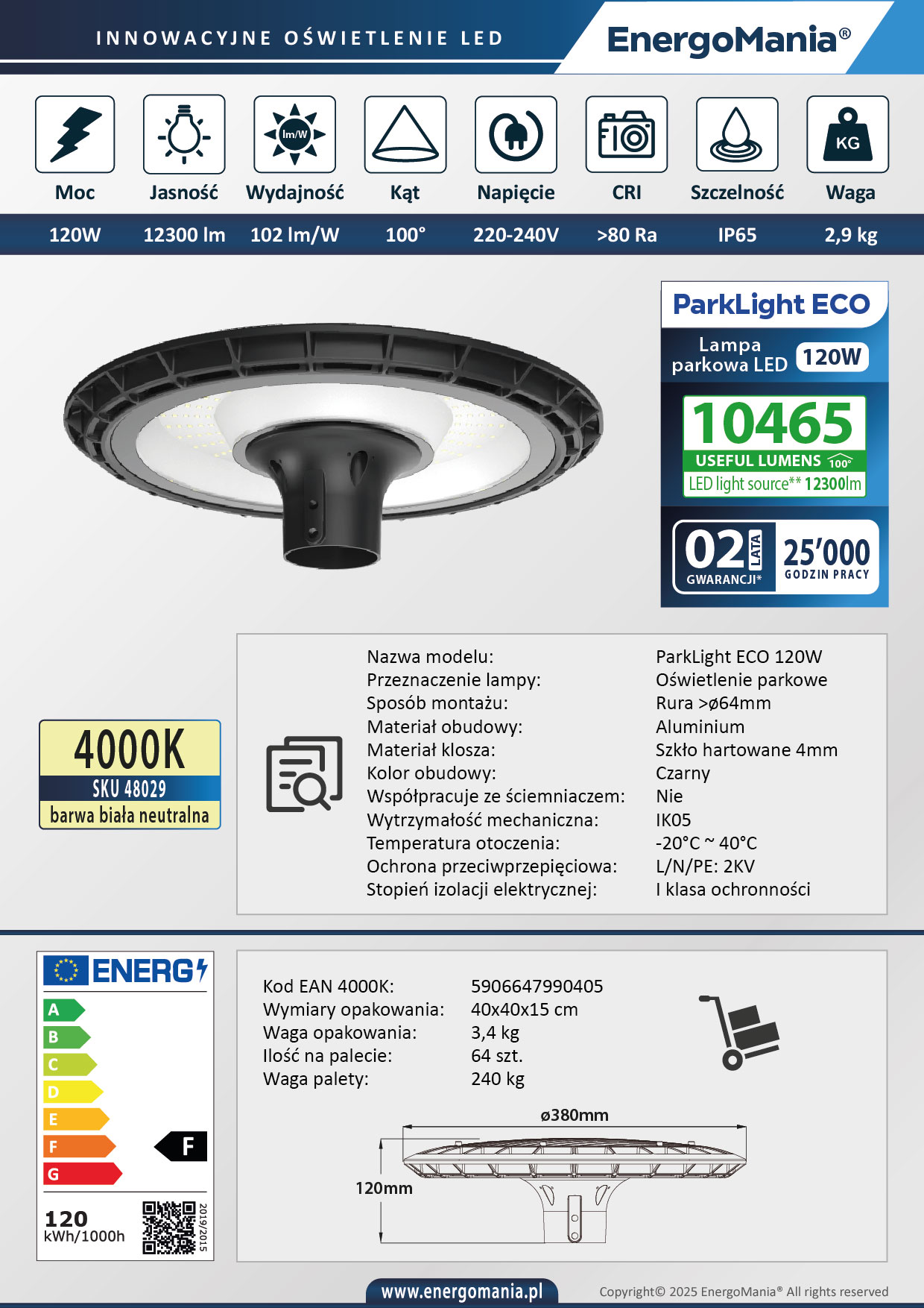 Lampa LED mocy 120W generuje 10465 lumenów, oferując szerokokątny rozsył światła (100°). Wysoki wskaźnik oddawania barw (CRI Ra>80) zapewnia naturalne odwzorowanie kolorów. Montaż lampy na słupie z rurą o maksymalnej średnicy 64 mm. Wymiary lampy to 120 x Ø380 mm. Gwarancja wynosi24 miesiące, a żywotność to 25 000 godzin (L70B50).