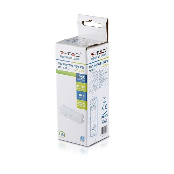 Natynkowy czujnik ruchu marki V-TAC® pozwala na automatyczną pracę wszelkiego rodzaju źródeł światła. Model VT-8036 ma wbudowany czujnik ruchu (mikrofalowy) z regulacją czasu świecenia (TIME) i momentu aktywacji zależnej od pory dnia (LUX) oraz odległości. Obudowa z tworzywa sztucznego ma kolor biały. Obudowa jest wodoodporna - klasa szczelności IP65. Wymiary 115 x 35 x 25 mm. Gwarancja 24 miesiące.