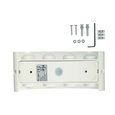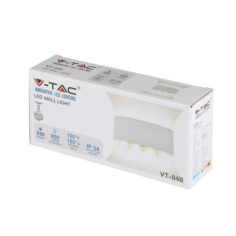 Kinkiet LED marki V-TAC® jest energooszczędną alternatywą dla typowych opraw halogenowych 75W. Osiem diod LED o łącznej mocy 8W emitują 800 lm. Model VT-848-W ma aluminiową obudowę w kolorze białym. Lampa ma osiem soczewek - świeci góra/dół pod kątem 150°. Oprawa ma wysoki wskaźnik oddawania barw CRI Ra>80. Kinkiet posiada w komplecie dedykowany zasilacz DC oraz kołki rozporowe. Produkt dzięki wysokiej klasie szczelności IP54 jest wodoodporny. Wymiary 220 x 48 x 90 mm. Gwarancja 24 miesiące.