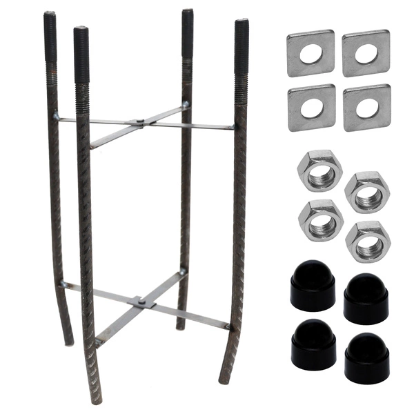 Solidna kotwa fundamentowaGotowe mocowanie PoleHolder 16x16 wykonane jest z czterech solidnych prętów zbrojeniowych średnicy Ø14 mm / długości 400 mm, połączonych poprzecznymi blachami. Rozstaw śrub po rozłożeniu kotwy wynosi 160 x 160 mm. Dolne końce kosza dla lepszego trzymania w betonie są zagięte do wewnątrz. W komplecie z kotwą znajduje się: |