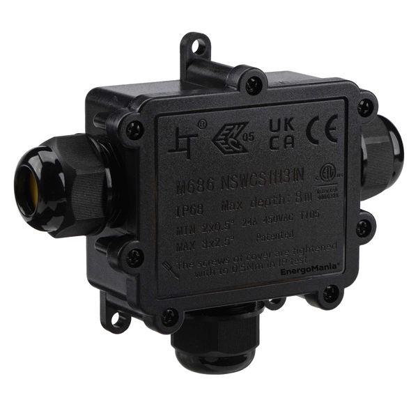 Instalacyjne złącze kablowe CableGuard marki EnergoMania® to profesjonalne rozwiązanie do zabezpieczania połączeń przewodów elektrycznych w wymagających warunkach - pod ziemią, a nawet zanurzone w wodzie. Puszka instalacyjna T-Box pozwala na wprowadzenie 3 kabli średnicy 8-12 mm. Jej jakość potwierdza szereg międzynarodowych certyfikatów CE, RoHS, UKCA, TÜV i ENEC.